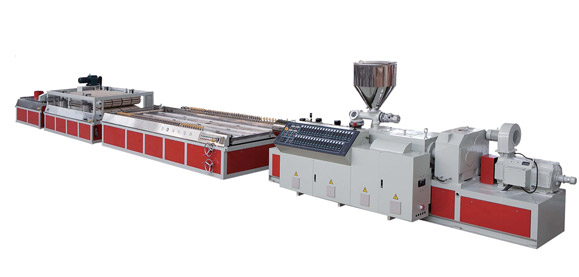 該生產線專用于寬幅PVC異型材生產線、木塑發泡門板、裝飾板擠出生產。生產線具有產量大,擠出穩定,發泡倍率高等優點。可生產各種裝 飾類制品,用途廣泛。制品表面硬度高,光滑平整,比重可控制在 0.6-0.9kg/m3之間。