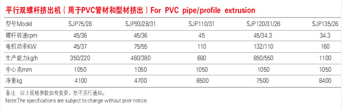 本公司生產(chǎn)的SJP各系列異向平行雙螺桿擠出機(jī),主要用來生產(chǎn)加工PVC管材和型材產(chǎn)品,具有產(chǎn)量高,塑化好, 節(jié)能降耗,運(yùn)行平穩(wěn)等顯著特點(diǎn),電氣控制配置先進(jìn),可以按照客戶的要求選擇電腦柜或儀表柜等;