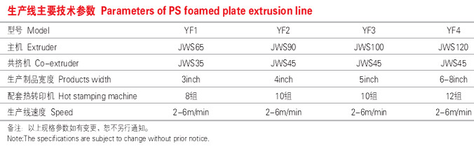 YF系列PS塑料發泡鏡框型材擠出生產線,主要有單螺桿主擠出機和配套共擠機,冷卻水槽,熱轉印機組,牽引機,切割機,翻料架組成,整條生產線配有進口ABB交流變頻器控制,進口RKC溫空儀表等元氣件,具有塑化好,產量高,使用可靠的特點。其中熱轉印機組是根據進口樣機改進設計而成,它主要采用熱壓印的方式,將色帶上的涂料壓印在發泡PS異型材上。該機外觀美觀、性能可靠、使用方便、燙印精確、吸附力強。且調節手輪可以壓印各種不同形狀的異型材。該設備主要和塑料擠出機、牽引機、切割機等配套使用,是目前塑料機械行業新開發的一種最新的配套輔機。
