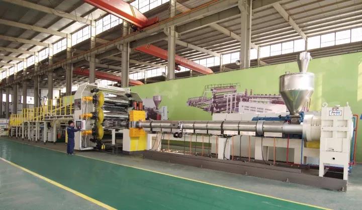 一進(jìn)入上海金緯片板膜設(shè)備制造有限公司總裝車間就可以看到組裝完畢的多條防水卷材生產(chǎn)線,諸如 PVC生產(chǎn)線線和TPO/PE生產(chǎn)線。通過參觀,嘉賓們深入了解到高分子防水卷材設(shè)備的組成以及各關(guān)鍵部件的重要性。全套生產(chǎn)線包括原料處理,擠出,壓光和輔機(jī)等系統(tǒng)。